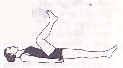 - प्रारंभिक स्थिति में लेट जाए। दाहिने पैर को घुटनों में वक्षस्थल पर ले आए।