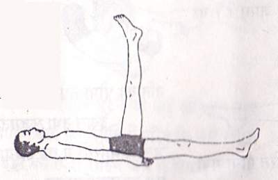 - पैर को 5 सेकंड तक रोक कर नीचे लाएं तथा भूमि से 5 सेंटीमीटर पर स्थिर करें। भूमि से स्पर्श न कराये।